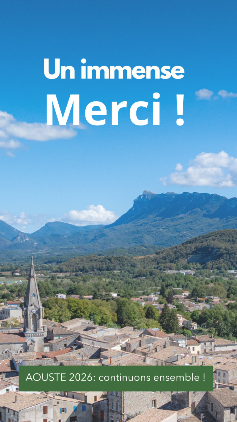 Continuons à faire d'Aouste-sur-Sye un village convivial et animé, avec des infrastructures rénovées, des mobilités sûres, des commerces et associations dynamiques, dans le respect de notre environnement.