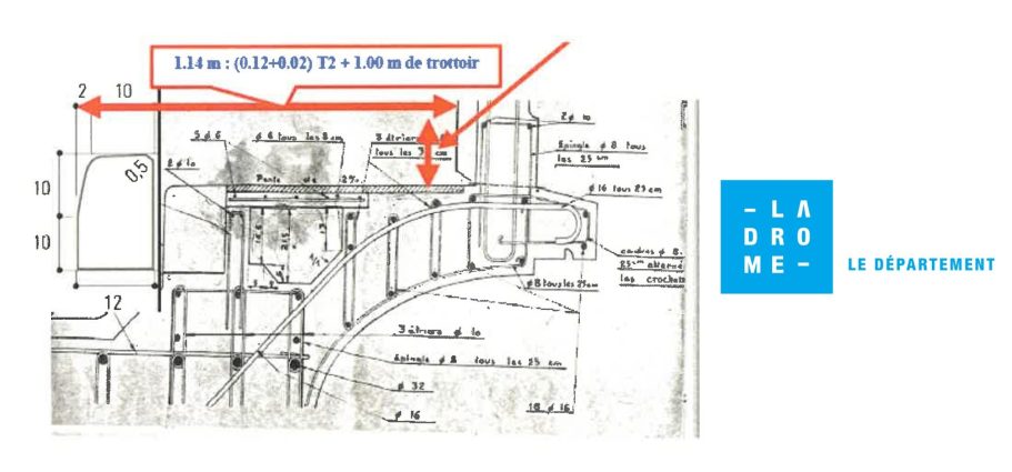 L’ouvrage existant est une voûte en béton armé construite en 1947, de type anse de panier, avec une portée importante de 65 m. Le pont comporte déjà deux encorbellements en béton armé de 0,95 m chacun. Dans ces conditions, aucun élargissement ni encorbellement supplémentaire ne peut être envisagé.