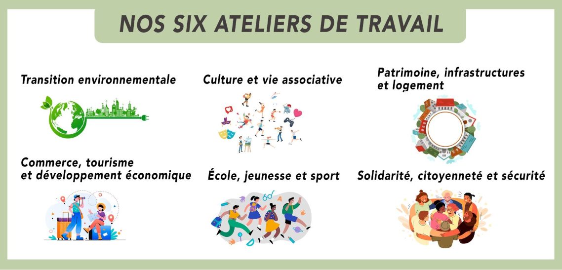 Notre travail s’articule autour de six ateliers de réflexion et de travail, ouverts aux idées et aux contributions des habitants.